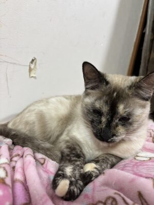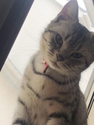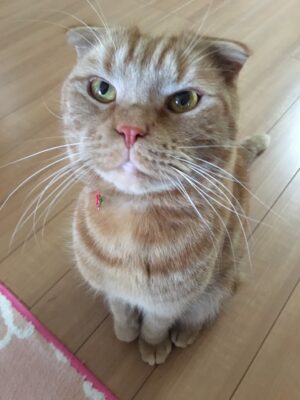 スコティッシュフォールドで、性格はとてもおとなしい子。静かに部屋の片隅でくつろいでいる姿は、見ているだけで癒されます。最近は日向ぼっこが日課です。