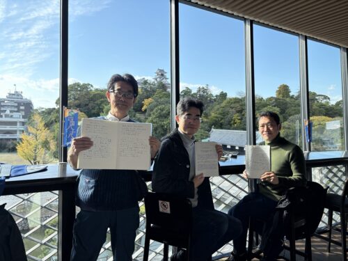 その仲間と高知城を眺めながら、高知城博物館で書き写しを行い