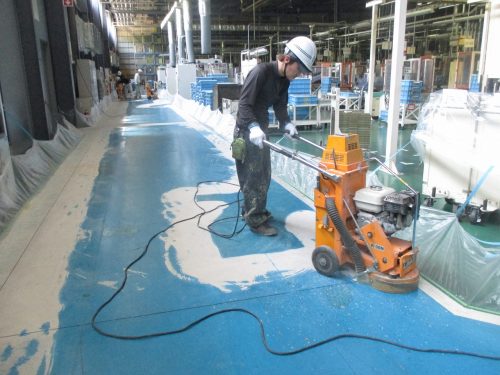 上の写真は床を機械で削っている様子です。