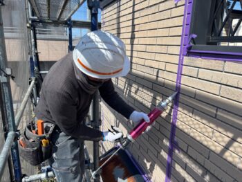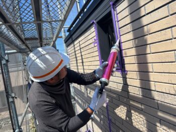 本日も関市内の現場にて、外壁塗装工事の非常に重要な工程である**「シーリング工事(コーキング工事)」**を行いました。
