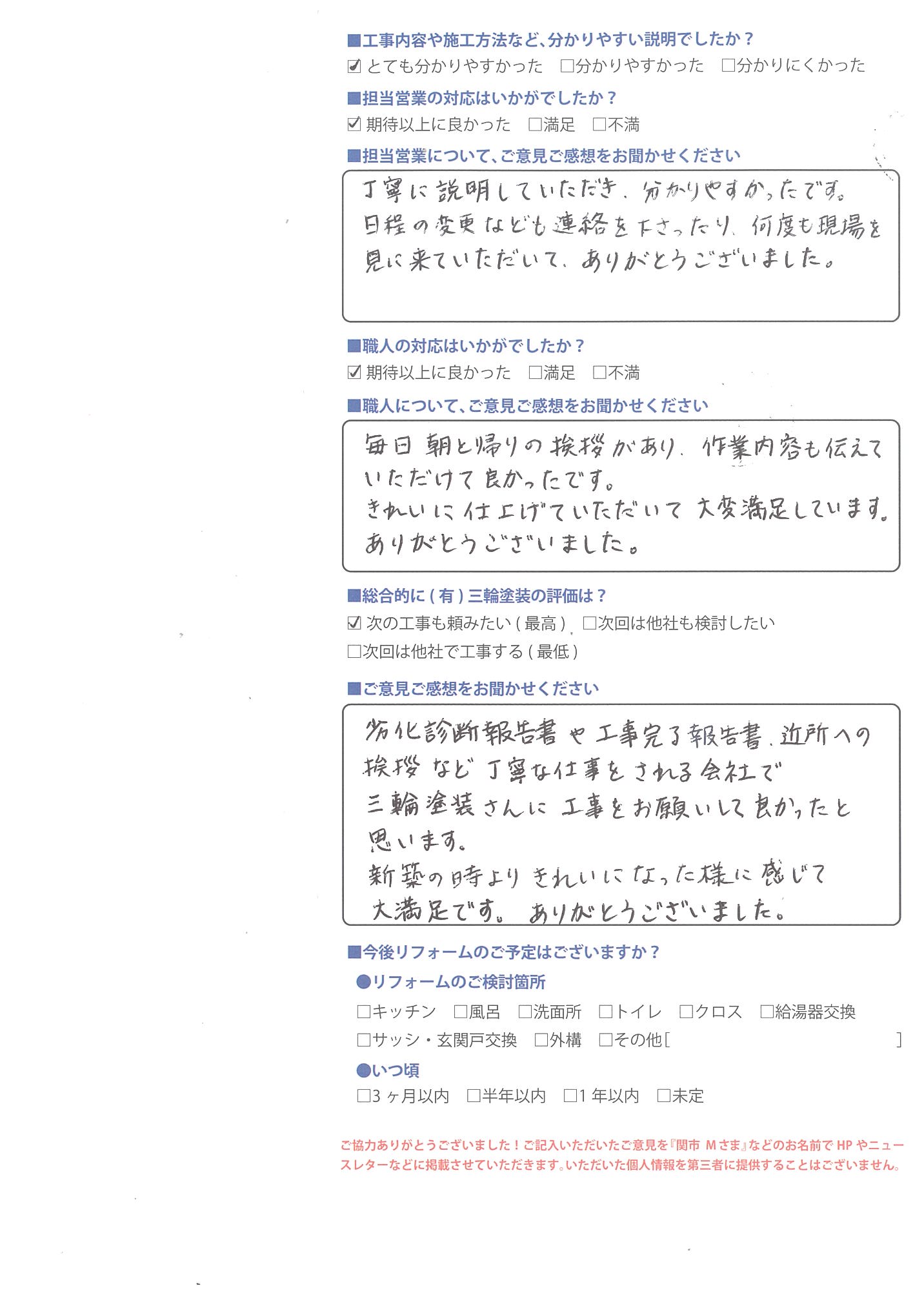 劣化診断報告書や工事完了報告書、近所への挨拶など丁寧な仕事をされる会社で 三輪塗装さんに工事をお願いして良かったと思います。 新築の時よりきれいになった様に感じて大満足です。ありがとうございました。
