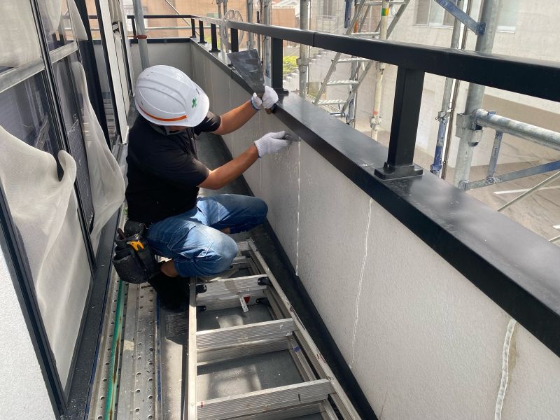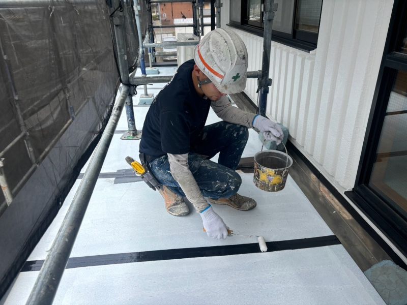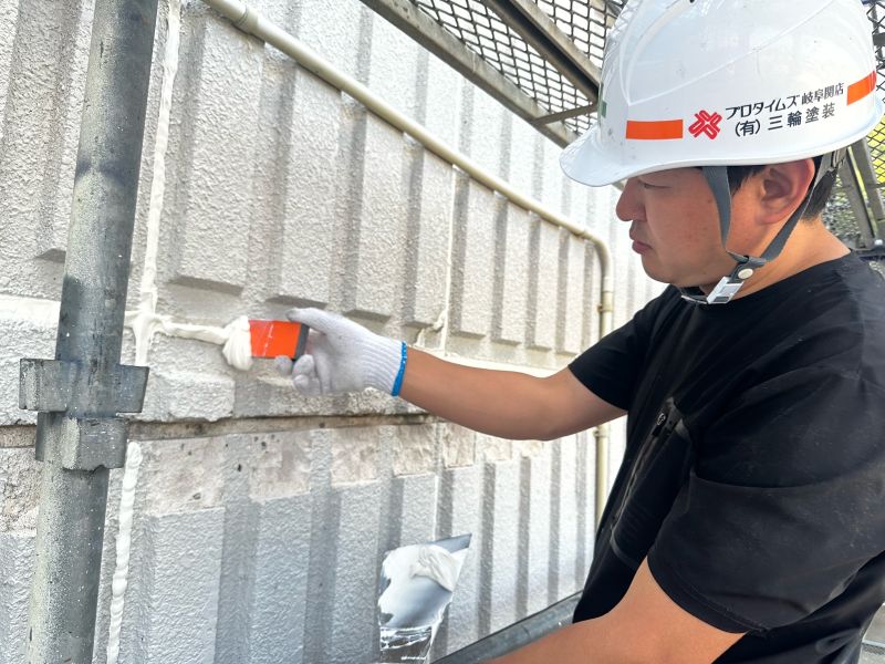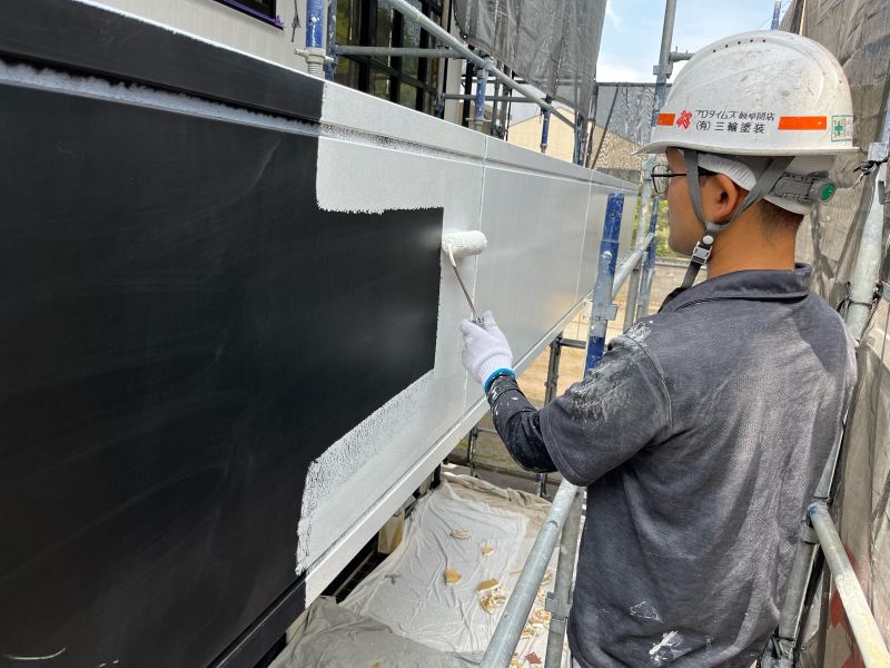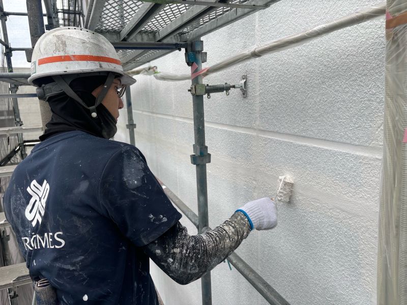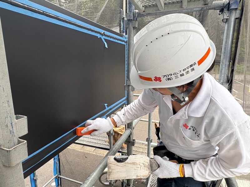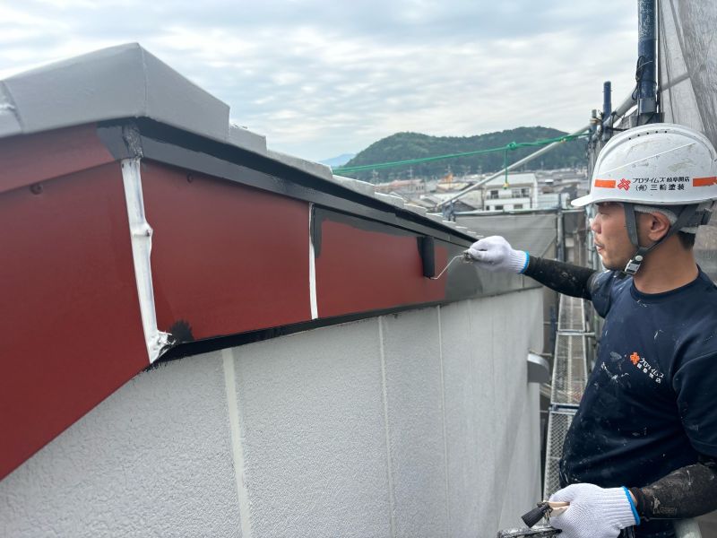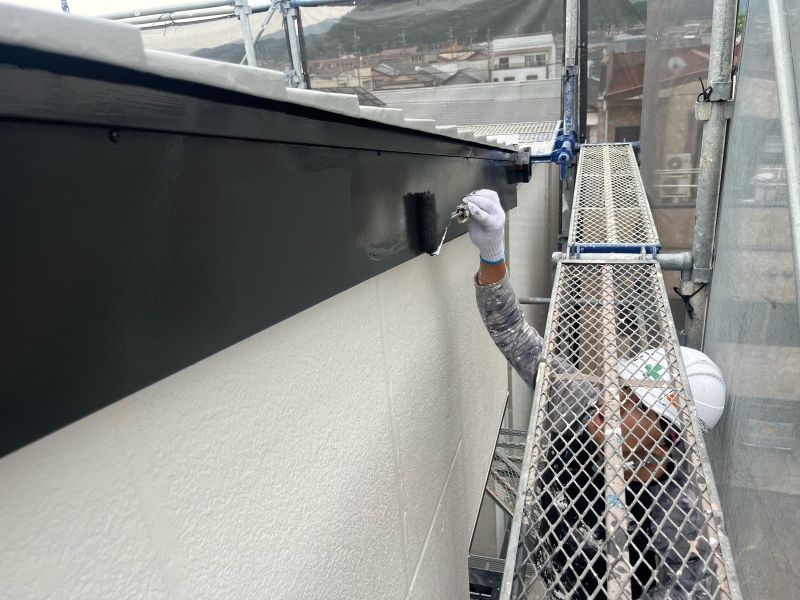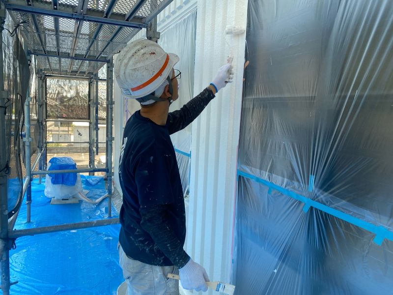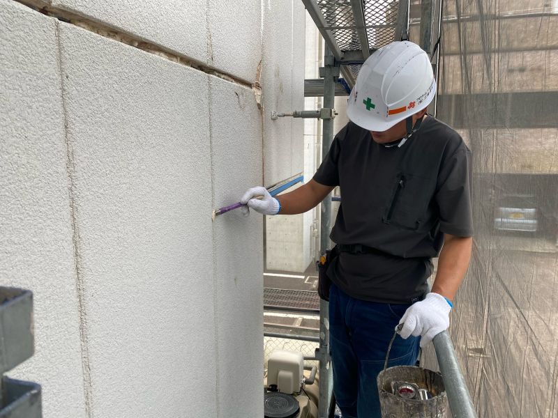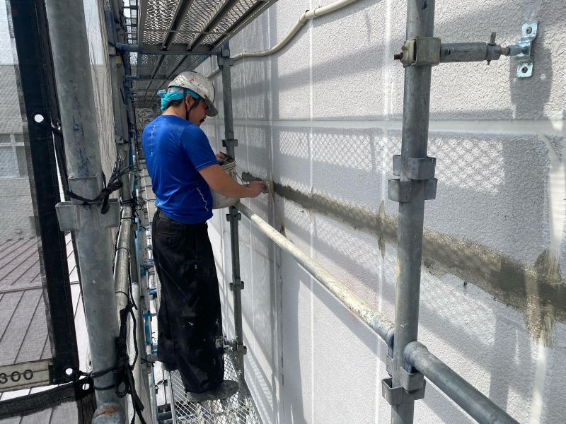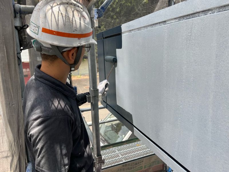 庇見付け 目地部シーリングプライマー塗布作業を行います