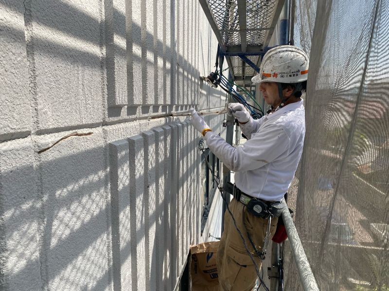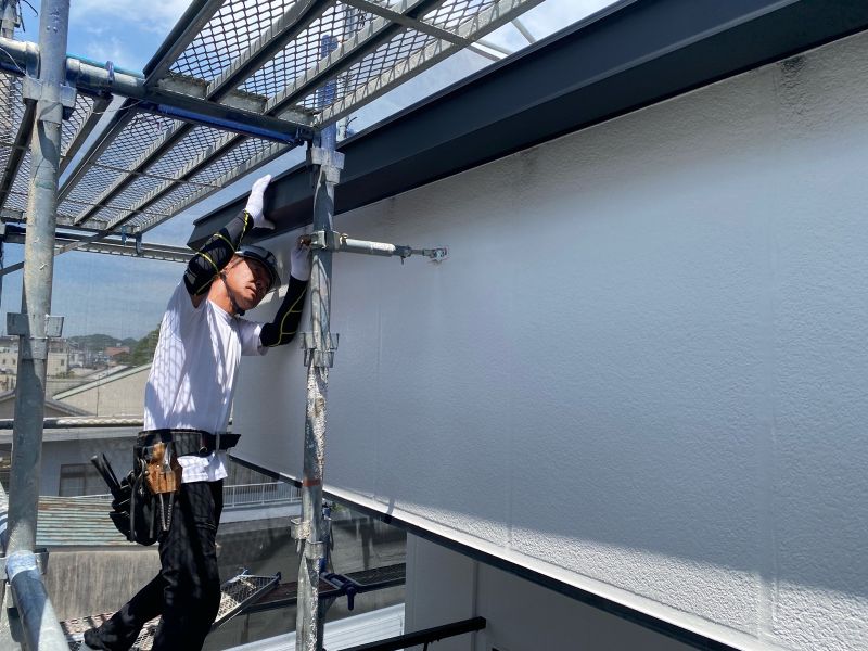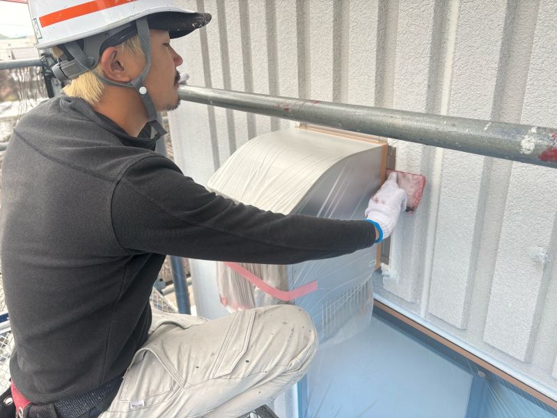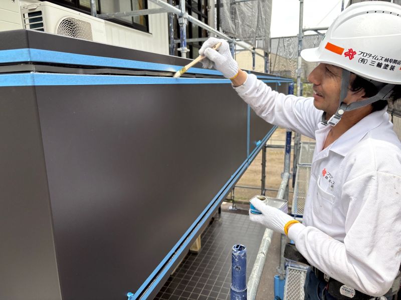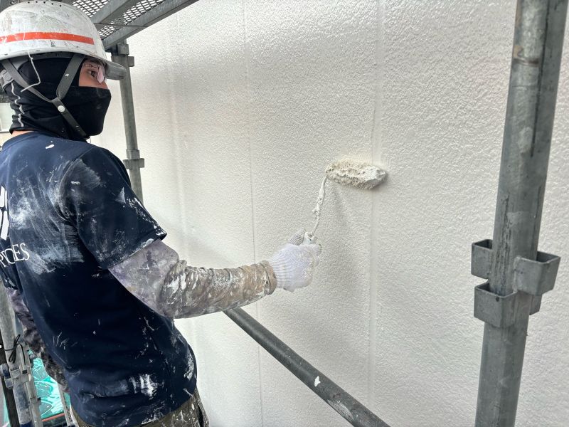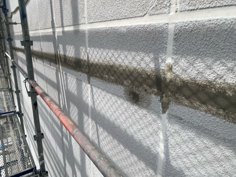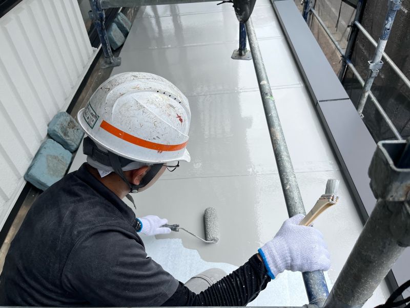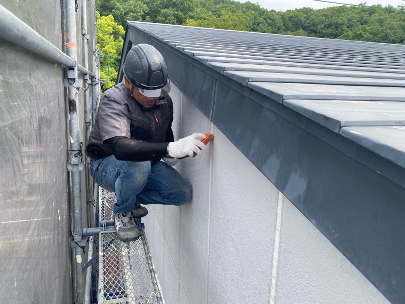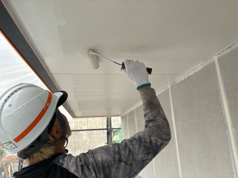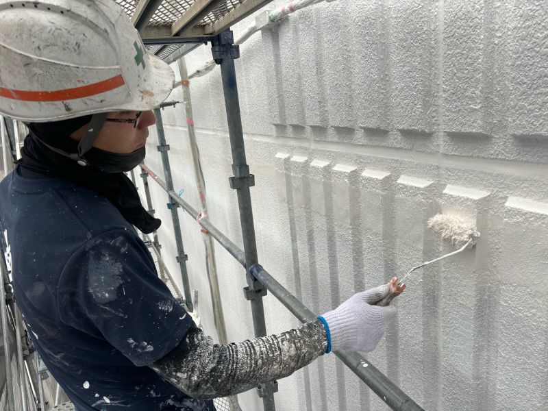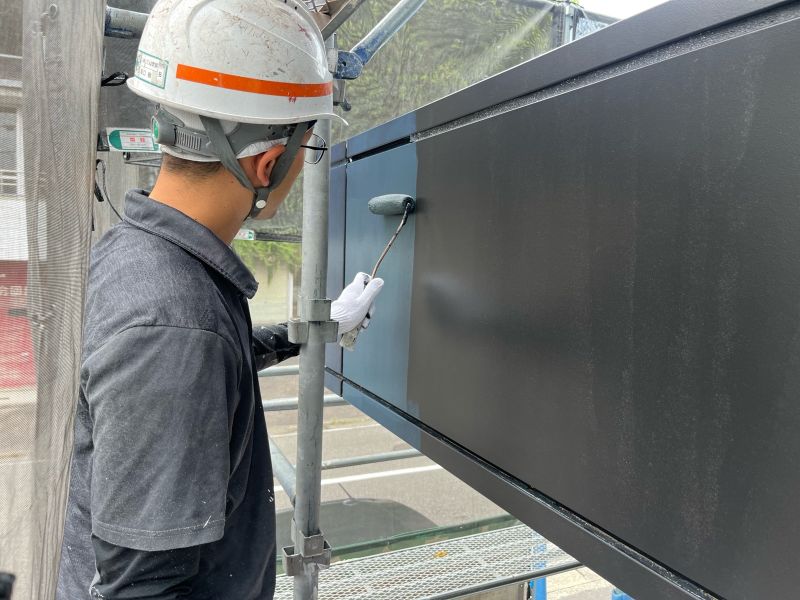 庇見付け 目地部シーリングプライマー塗布作業を行います