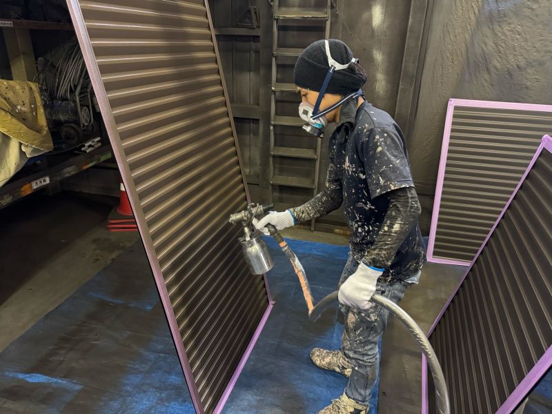 雨戸 取り外して現場から社内作業場にて吹付け塗装を行います